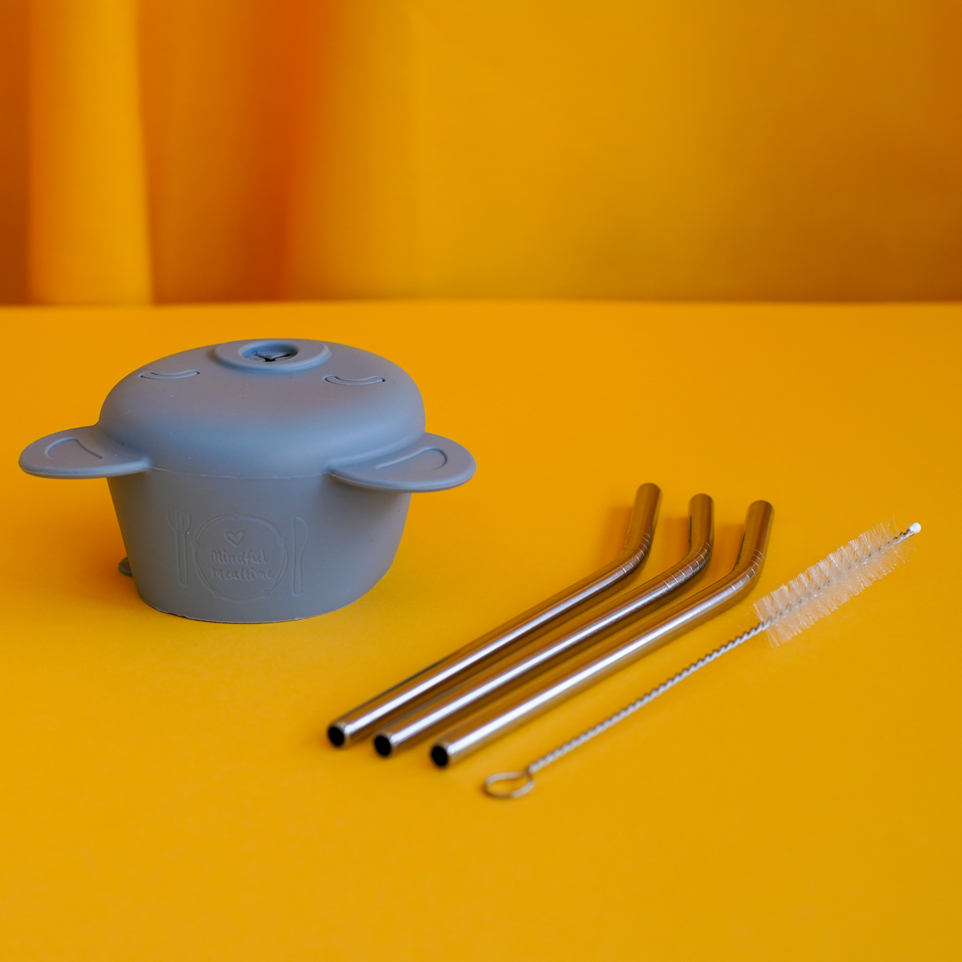 Silicone Bear Head and 3pc Stainless Steel Straw Set
